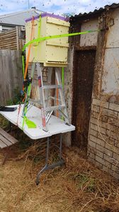 In an ideal situation the new hive box is placed as close to the old hive entrance as practically possible. This allows returning foragers to easily find the new hive.
