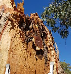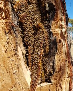 When this tree split in half it managed to split a beehive as well. About seventy percent remained up top while the other thirty percent ended up on the ground. Unfortunately the queen was lost in this accident so the bees abandoned the part of the hive on the ground and took those resources back up to the hive in the tree.
